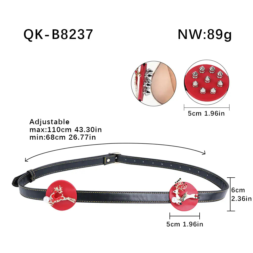 Crafted from soft, durable faux leather, the adjustable strap connects two padded circles decorated with holiday-inspired charms like snowflakes, Christmas trees, and cute characters. The red-and-black color palette creates a striking festive contrast, while the metal spikes offer a teasing mix of pleasure and pressure.
